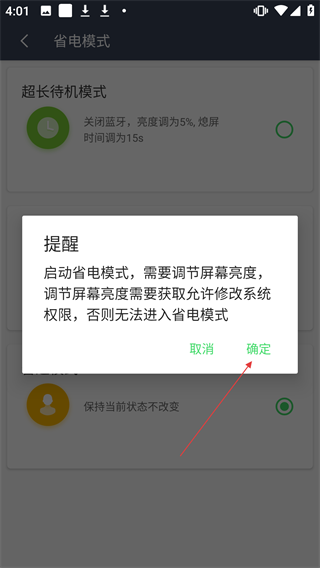 4、在省电模式提醒弹窗中点击【确定】,获取修改系统权限以启动省电模式。