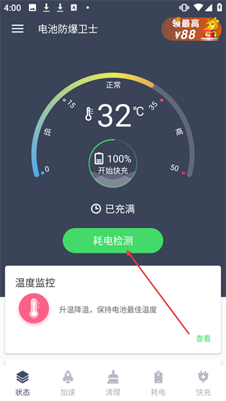1、在电池防爆卫士界面点击【耗电检测】,进行耗电情况检测。