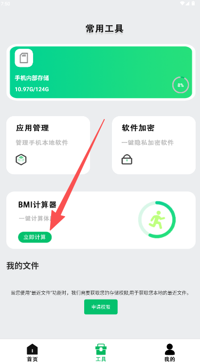 2、在工具页找到“BMI计算器”模块点击“立即计算”按钮。