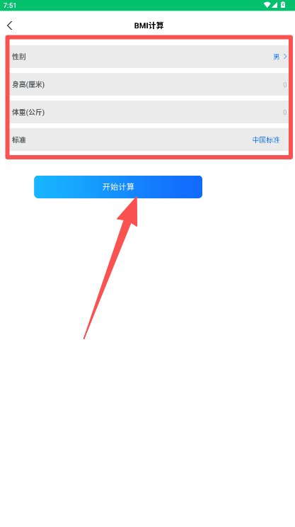 3、在计算页面输入身高体重数据后点击“开始计算”获取结果。