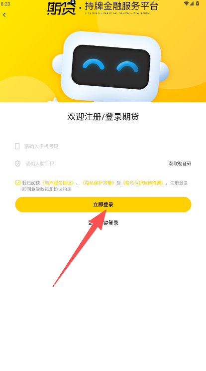 1、在登录页输入手机号与验证码并勾选协议后点击“立即登录”。