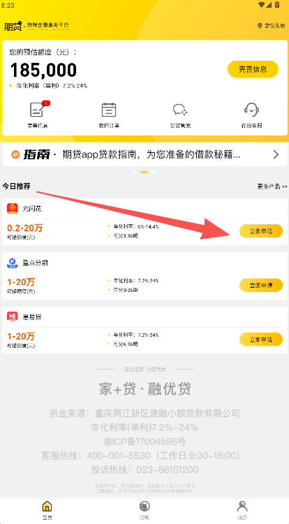 《期贷》是一款提供个人信贷服务的软件,核心特色是展示多款贷款产品的预估额度与利率信息,帮助用户快速了解可借金额。软件界面简洁,并引导用户完善信息以获取更精准额度。亮点在于产品对比直观,优势是信息透明,资金来源、利率说明、客服投诉渠道均公开,辅助用户安全、高效地选择适合的贷款方案。