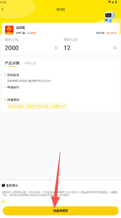 3、在申请页填写借款金额与期限后点击“同意并提交”按钮完成贷款申请。