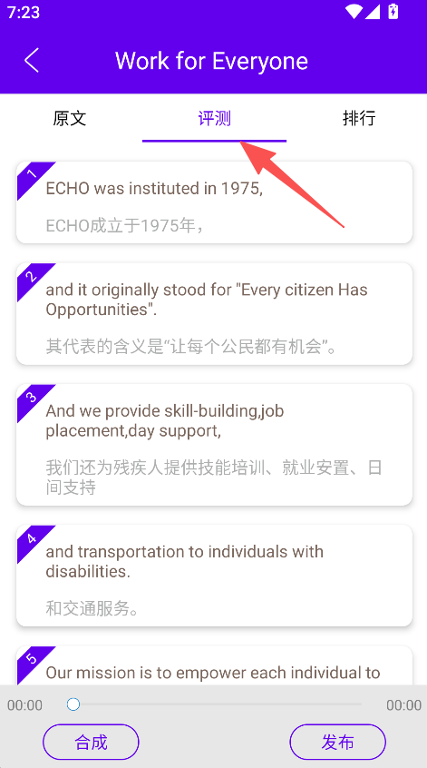 2、支持口语评测功能,可练习视频相关内容发音,提升口语表达准确性,功能有效。