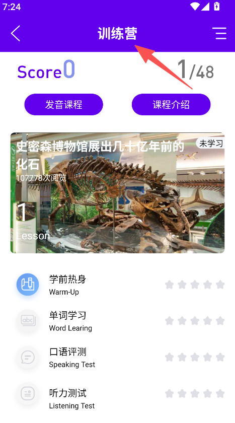 3、实现训练营学习功能,包含发音课程、单词学习、听力测试等,系统提升英语综合能力,功能全面。