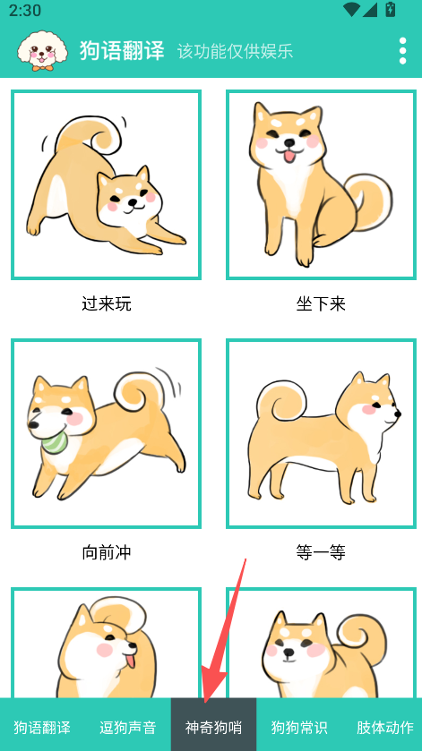 3、内容呈现直观,狗语翻译以卡通狗狗展示,常识和肢体动作以图文结合,方便用户理解,特色突出。