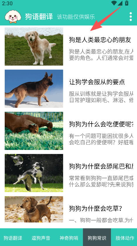 2、狗狗常识板块实用性强,讲解狗的行为、养护等知识,助力用户科学养犬,亮点实用。