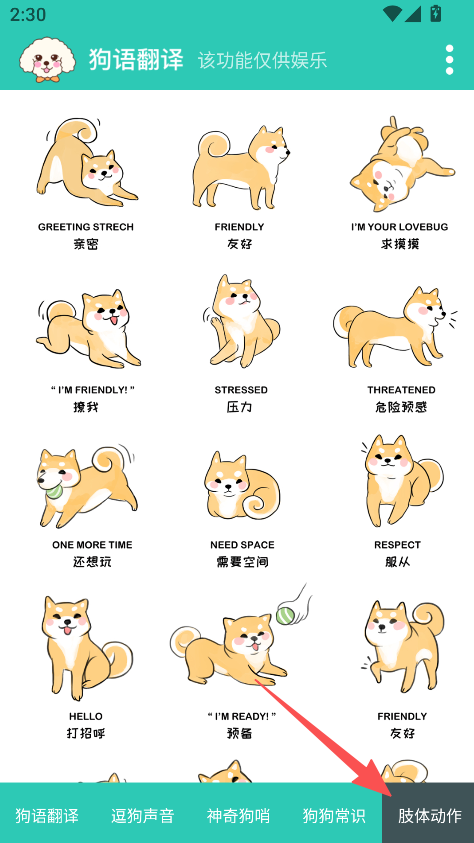 3、点击“肢体动作”,了解狗狗不同姿态的含义。