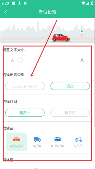 2、在考试设置页选择语言类型、科目等参数,确认后返回主界面,就能匹配对应练习内容啦。