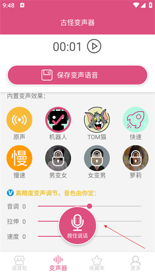 2、选择目标变声效果(如【机器人】),按住【按住说话】按钮录制语音。
