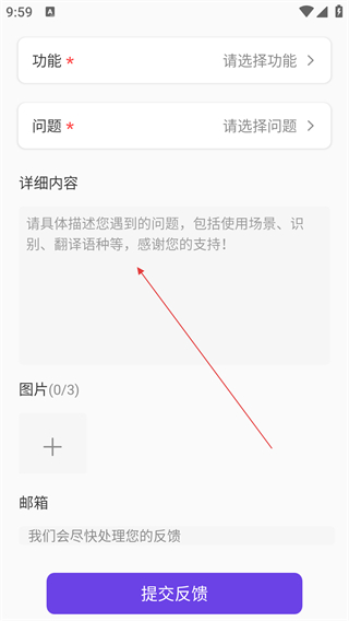 4、在反馈页面选择功能、问题类型,填写详细内容并补充图片/邮箱后,点击【提交反馈】完成操作。