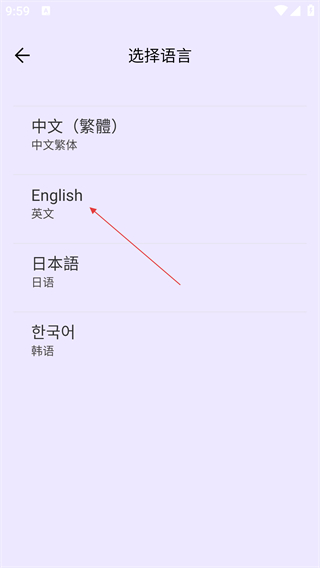 3、在语言选择页面,选择目标语言(如【English】),应用将切换为对应语言显示。