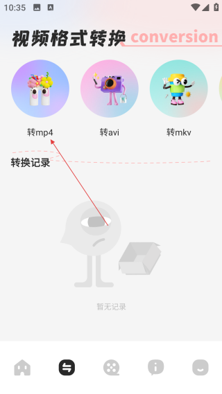 2、在转换页,选择【转mp4】选项,进入需要转换格式的视频选择界面。
