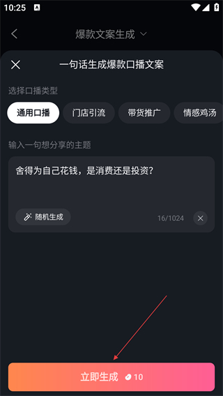 3、在编辑页输入想要分享的主题,选择【随机生成】后,点击【立即生成】获取文案。