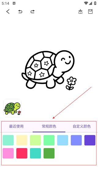 3、在素材页面选择目标图案(如乌龟),进入该图案的上色编辑界面。