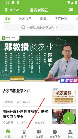 1、在湘农科教云首页,点击底部【课堂】,进入课程学习的功能选择页面。
