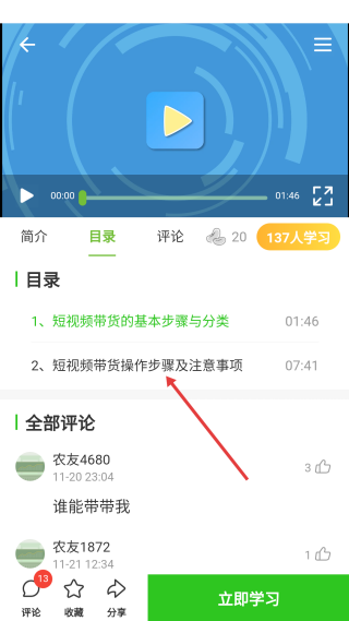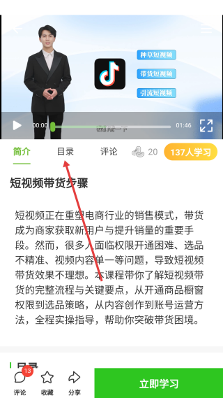 2、在课堂页,选择【短视频带货步骤】课程,进入该课程的详情介绍页面。