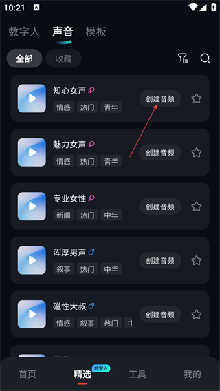 2、进入【声音】页面,选择如【知心女声】的声音,点击对应【创建音频】按钮。