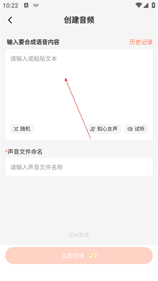 3、在【创建音频】页面,在输入框输入文本,并填写声音文件命名,点击【立即生成】。