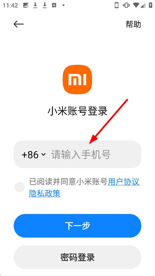 3、在小米账号登录界面输入手机号,勾选协议后点击下一步。