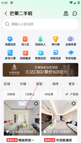 2、进入二手房专区后,选择目标房源卡片,点击可进入该房源的详情页面。