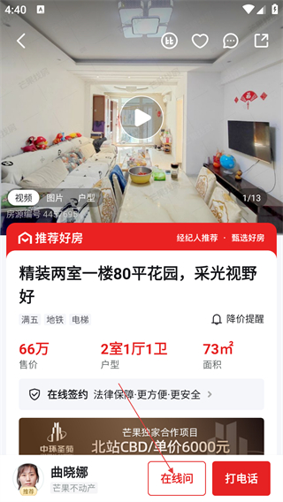 3、在房源详情页,点击【在线问】按钮,可发起与对应经纪人的咨询对话。