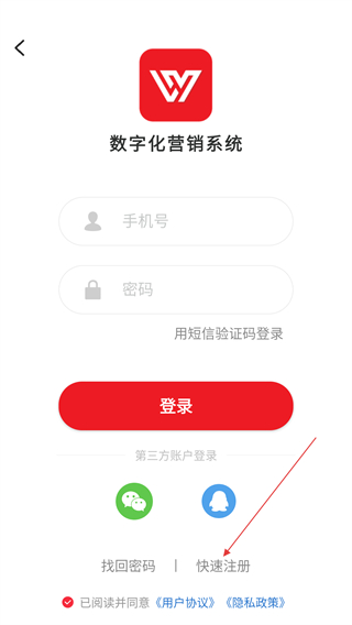 3、在账号密码登录界面,点击【快速注册】选项,可进入新用户的注册页面。