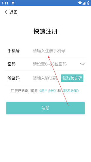 4、进入快速注册页面后,填写手机号、设置密码、验证码,勾选协议后点击【注册】完成操作。