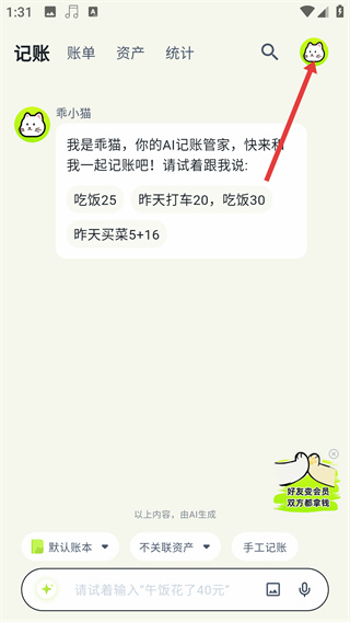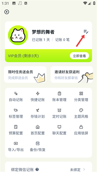1、在记账APP首页点击右上角【猫咪头像】,进入个人页面。