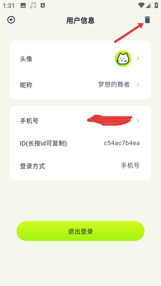 3、在用户信息页面点击右上角【垃圾桶图标】,触发删除账号流程。