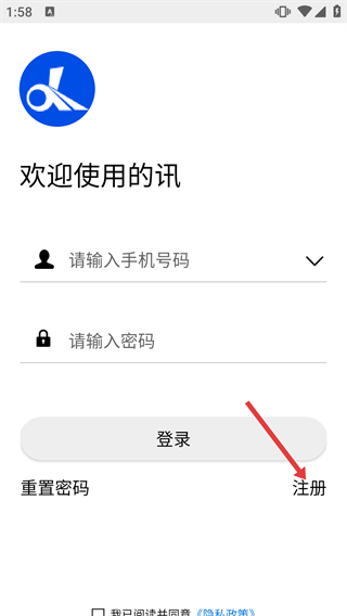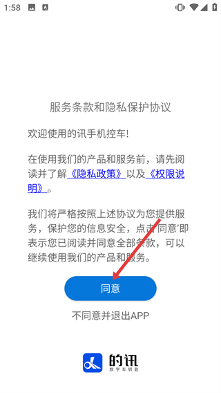 1、在的讯手机控车的服务条款页面,阅读《隐私政策》《权限说明》后点击【同意】按钮,进入账号登录界面。