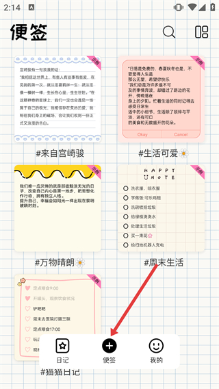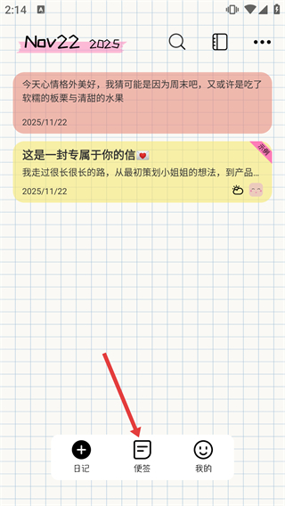 1、进入日记应用主界面,点击底部【便签】选项,进入展示示例便签的便签功能页面。