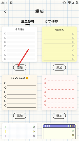 3、在模板页面,选定【清单便签】模板并点击“添加”,进入对应的编辑便签界面。