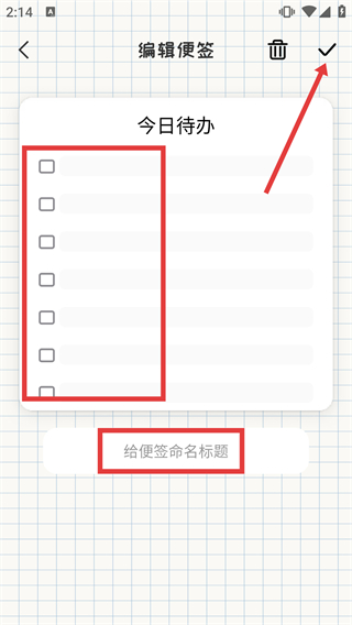 4、在编辑便签页面,填写待办内容并命名标题后,点击右上角对勾按钮保存该便签。
