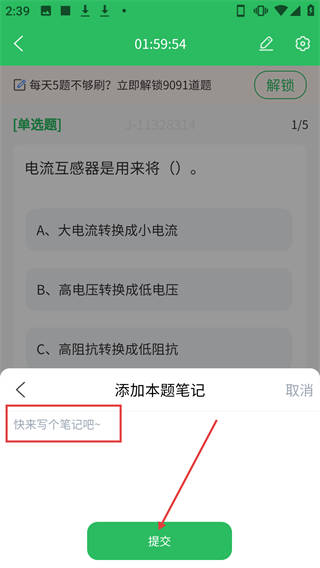 4、在添加本题笔记的输入框中输入笔记内容后,点击【提交】可完成笔记添加。