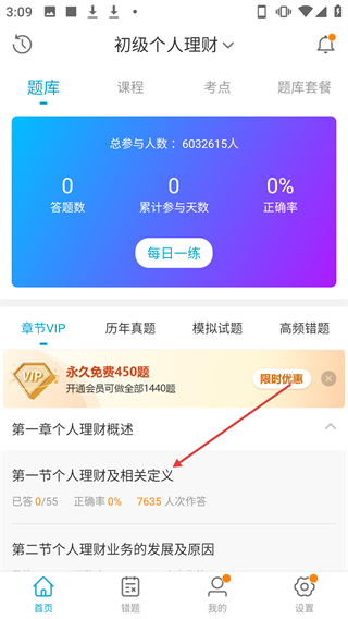 2、点击【第一节个人理财及相关定义】,进入试卷详情页面。