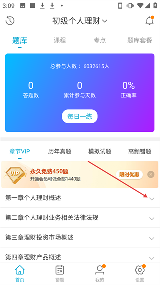 1、在【初级个人理财】题库页面,点击【第一章个人理财概述】右侧下拉箭头展开章节。
