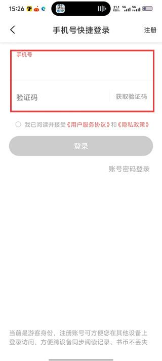 3、在手机号快捷登录界面,输入手机号和验证码。