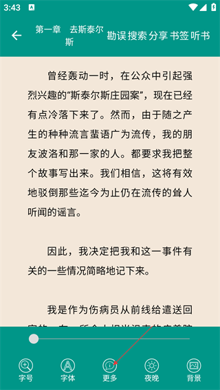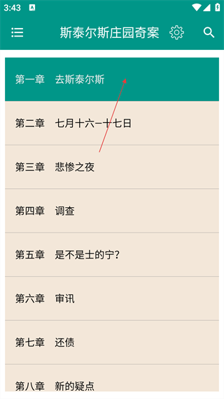 1、打开书籍《斯泰尔斯庄园奇案》后,点击章节区域,调出阅读功能栏。