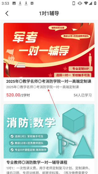 2、在1对1辅导页面选择【2025年教学名师考消防学院一对一高端定制课】进入课程详情页。