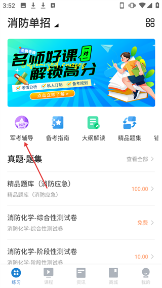 1、在消防单招页面点击【军考辅导】进入1对1辅导页面。