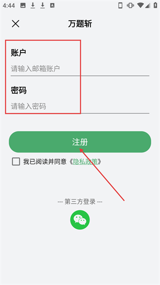 4、在注册页面,在【账户】和【密码】栏输入信息后点击【注册】完成账号注册。