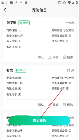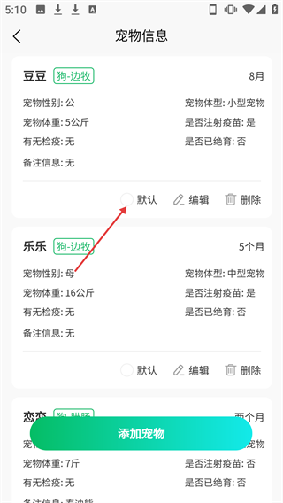 2、在宠物信息页面点击【添加宠物】进入添加宠物信息表单页。