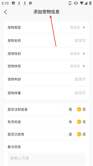 1、在首页点击【添加宠物信息】进入宠物信息页面。