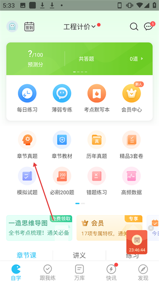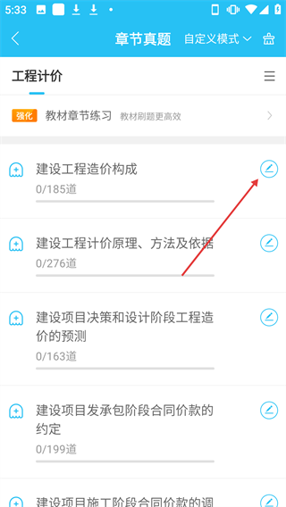 1、在工程计价学习页面点击【章节真题】进入章节真题列表页。