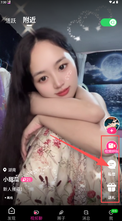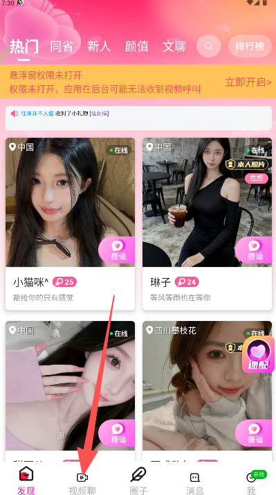 2、在首页下方导航栏找到并点击“视频聊”入口。