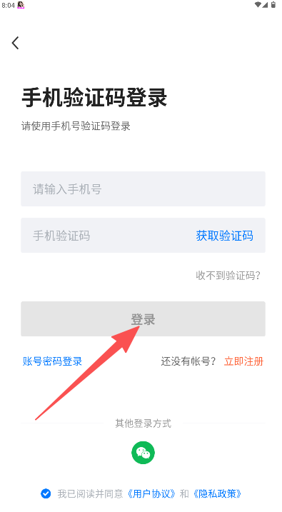 1、在登录界面输入手机号并获取验证码,勾选协议后点击“登录”。