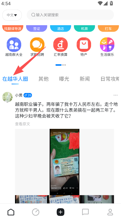 1、打开软件,进入在越华人圈,浏览当地动态、特产信息。