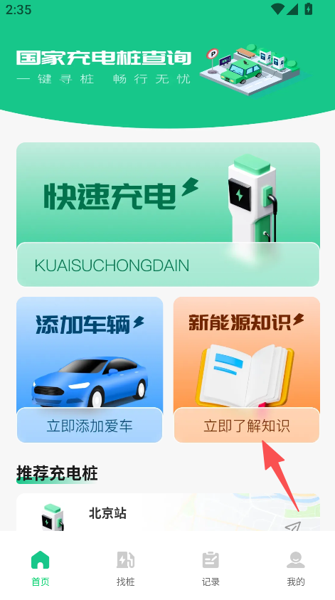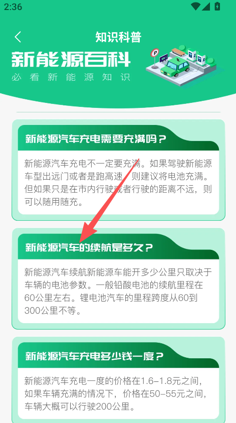 1、打开软件,点击新能源知识,查看新能源汽车续航、充电费用等科普内容。