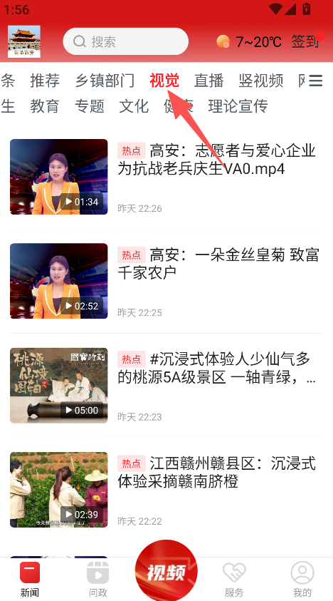 1、打开软件,点击视觉,浏览高安志愿者庆生、金丝皇菊致富等本地视频资讯。
